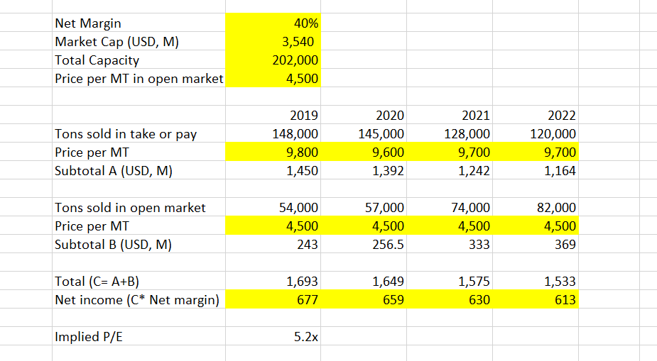 When Pabrai talks about his investment theses, he generally talks about things that with the benefit of hindsight seemed obvious. One of his suggestions (that he repeats constantly) is “Thou shalt not use Excel”. Using this mindset (and very little Excel), we believe that what Pabrai likes is the change to take-or-pay contracts, combined with an improvement in the industry dynamics that will cause a higher price for electrodes, on top of a demand with inelastic characteristics. Let’s remember that Pabrai’s strategy (detailed in The Dhandho Investor) is heads I win, tails I don’t lose much. Using the data from the annual report (and the last quarter) we can perceive that the company is trading at ~5x P/E in a very conservative scenario. What is in yellow below are our assumptions and implications. We believe that the most controversial one could be the net margin one. If we look at history, it has been very erratic, although in 2018 it reached 45%, while in 2019 it has been 41% and in 2Q19 it was 41%, we are using 40%. From what was forecasted at the end of 2018 to the current spot price, we see an interesting increase for what is sold outside take-or-pay contracts. However, we preferred to leave the 10-year average price of US$4500 per MT.