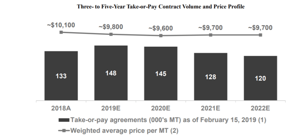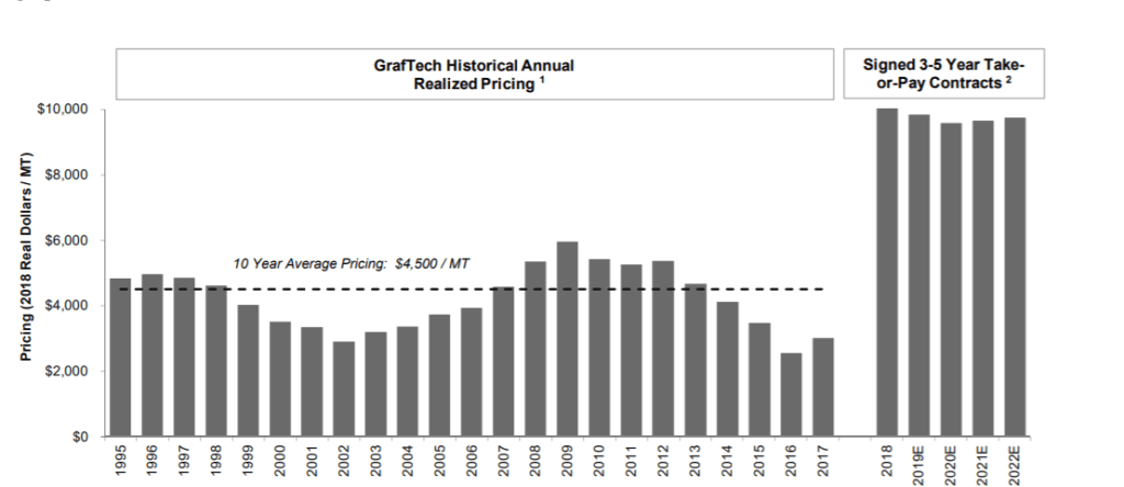 Graftech recently changed the way it conducts its business. Nowadays, it implements take-or-pay contracts, in which it establishes a price and a quantity of electrodes to deliver. In case the client does not want/cannot receive them, he must pay what was established in the contract. The average price at which contracts were signed were US$9700 per MT, and the 10-year average is US$4500. These contracts represent 65% of total sales towards 2022, the remainder of production will be sold at spot prices.