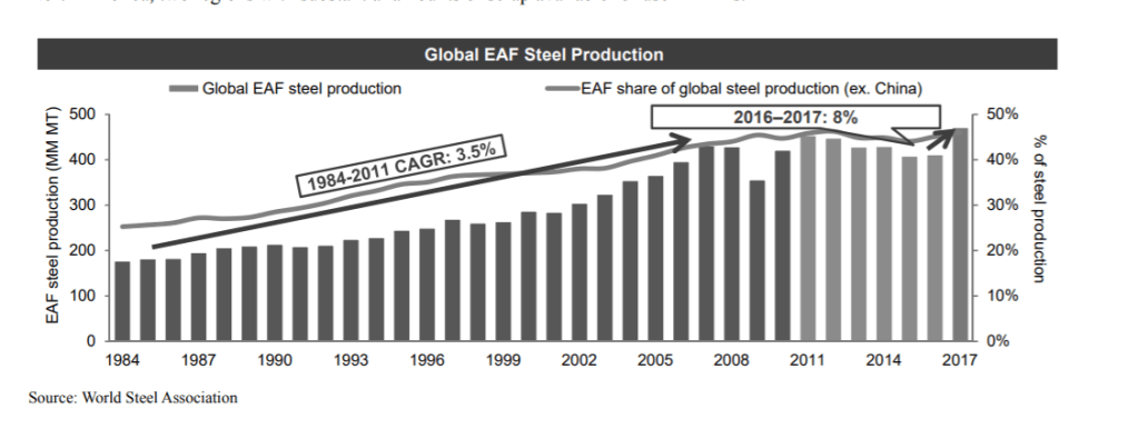 Graftech hace electrodos de grafito. Básicamente es un material (el único que se Graftech makes graphite electrodes. Basically it is a material (the only material that can handle the energy of the process) that is used to heat furnaces where steel is processed. There are two ways to process steel: the basic oxygen furnace (BOF) and electric arc furnaces (EAF). The main difference (apart from the energy source) is the type of material that they require to process steel: BOF requires as primary source iron ore, while EAF can use steel leftovers. Another difference is that capex to install a BOF plant is around US$1100 per ton, while for EAF capex is significantly less at US$300 per ton. Steel production with EAF is about 46% of total production (ex China).