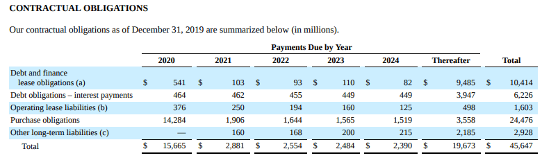 Going into the annual report, we find out that VLO’s contractual obligations are of around $15.7B for 2020. Out of the total amount, 91% comes from Purchase Obligations, which are defined as follows: “A purchase obligation is an enforceable and legally binding agreement to purchase goods or services that specifies significant terms, including i) fixed or minimum quantities to be purchased; ii) fixed, minimum, or variable price provisions, and iii) the approximate timing of the transaction.”