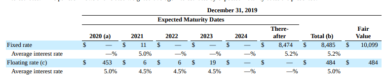 VLO has a a combination of fixed and variable rate financing through a bullet structure, mostly focused on principal repayments after 2024. For 2020, debt repayments should be around $453 M.