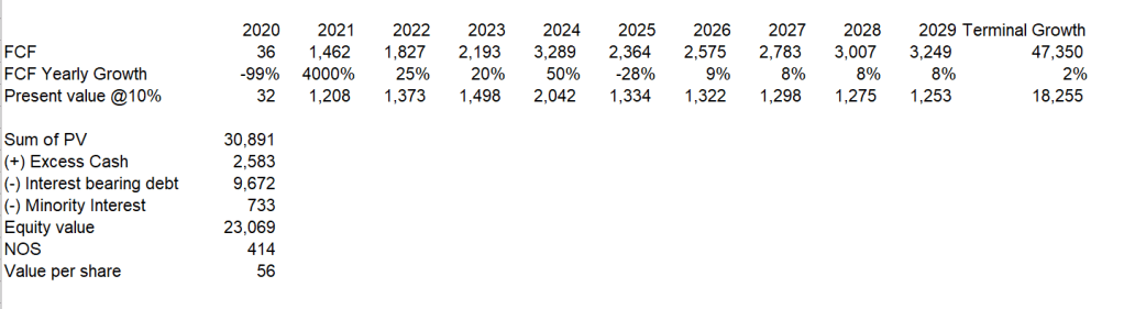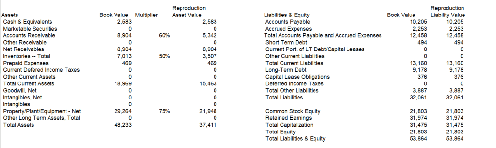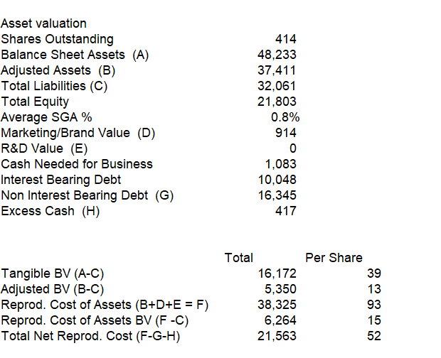 For this exercise we will discount the asset side of the balance sheet with a 40% to accounts receivable, a 50% to inventories and a 25% to PP&E. We then subtract net debt to have an idea of the reproduction cost of adjusted assets, which comes around $52 per share.