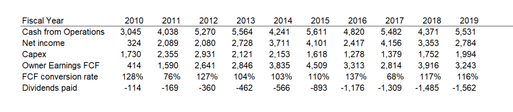 The company has been aggressive in terms of returning capital to shareholders via buybacks and dividends, spending $2,614 M in 2017, $3,077 M in 2018 and $2,269 M in 2019. Just to provide some context on the previous oil crisis (2015 and 2016), these amounts were $3,686 M and $2,447 M, respectively, up from $1,850 M in 2014. Something we highlight from the previous crisis is the increased activity (almost up 100% YoY) in share repurchases during 2015 when the oil price fell ~30%.