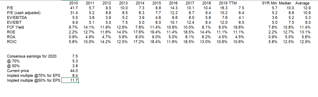As we mentioned before, doing a simple exercise with the P/E multiple, we can argue that the current 7.5x is very close to 2014 lows, only surpassed by 2011’s 5.7x. Assuming a 25% and 50% discount to 2020E EPS from consensus, we have some margin of safety vs. history. If we use the median PE multiple for 2020E earnings at a 30% discount, we get an estimated price of $53, or $38 using a 50% discount, which we consider would be a floor.