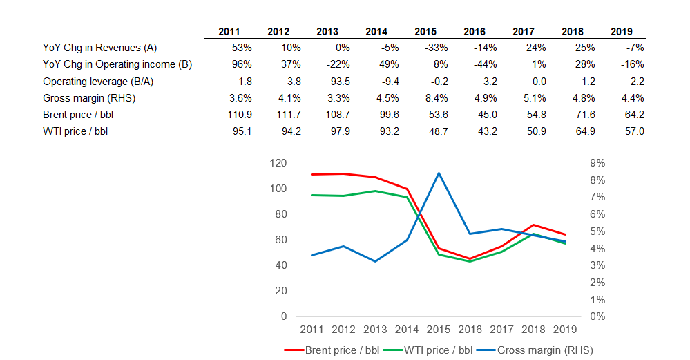 Even during times of stress, VLO has proved it has a strong FCF conversion capacity. For our exercise, we are using a near 100% decrease in FCF for 2020, with only marginal recoveries to previous levels going forward. Please note that the last 4 years average FCF is $3,322 M. Our DCF assumptions lead to a value of around $56 per share. Part of what makes us be particularly wary on 2020’s FCF is the current degree of operating leverage. Back in the end of 2015, operating leverage was actually negative, not positive as today. This does not make us pessimist, but we believe a steeper contraction than in the previous oil shock is not out of question.
